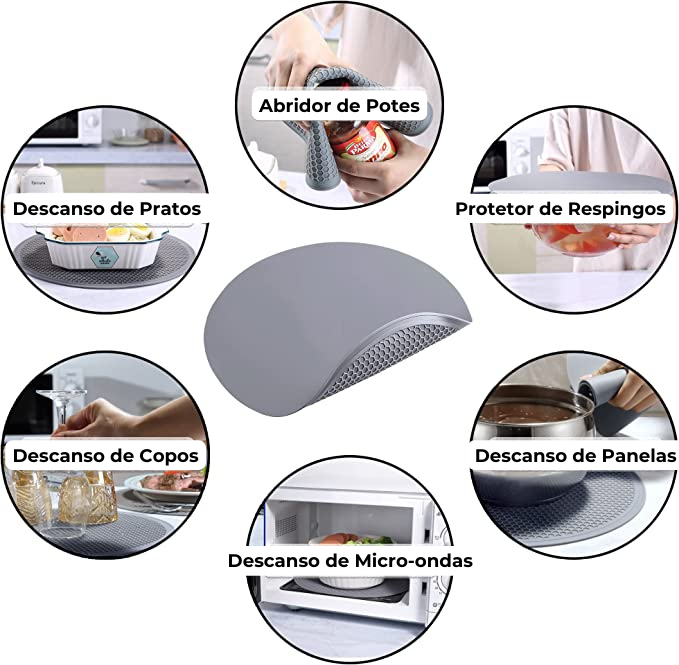 Descanso Multiuso - Pode ser usado como cobertura para respingos no micro-ondas, porta-pratos, pegador de panelas, cobertura para alimentos no micro-ondas, descanso para utensílios, abridor de frascos, descanso para ferro de enrolar cabelo, entre outros.